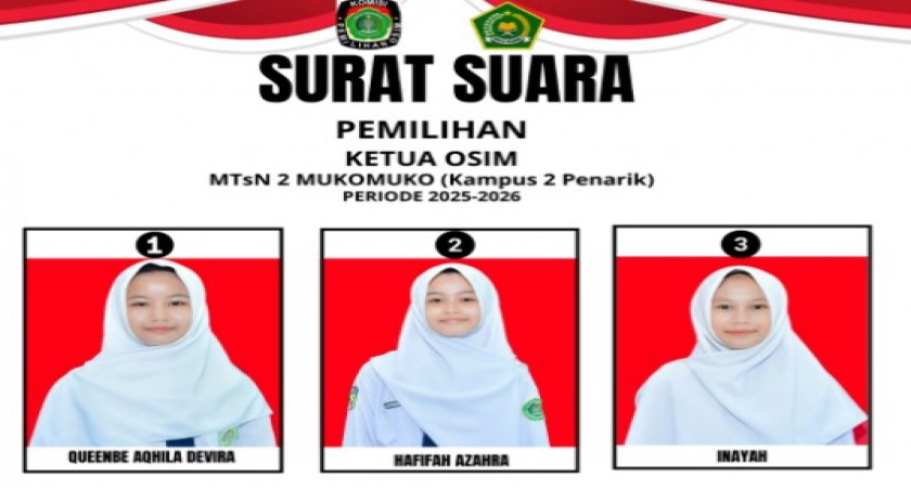 MTsN 2 Mukomuko Kampus 2 sukses melaksanakan pemilihan umum ketua dan wakil ketua OSIM periode 2025–2026 pada Kamis (2/10/2025). Bertempat di halaman madrasah, kegiatan ini berlangsung semarak dan diikuti seluruh warga madrasah dalam suasana layaknya pesta demokrasi sesungguhnya.